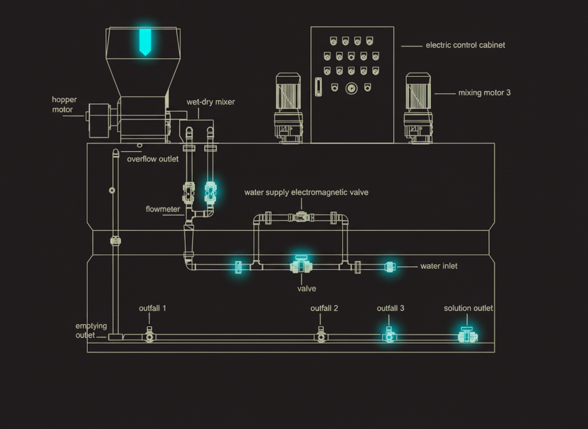 Equipped with advanced PLC logic, the system manages the entire preparation process autonomously. Features include intermittent or continuous operation and automatic cross-stirring for perfect solution fusion.